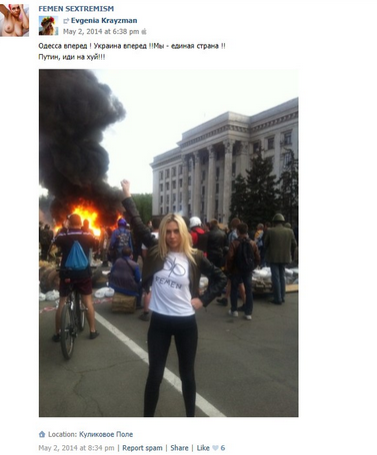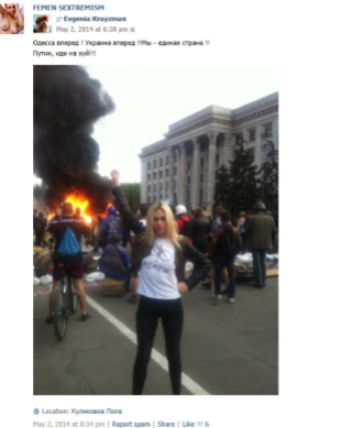 Et le tout photographié à Odessa devant le fameux incendie tuant 50 personnes ayant manifesté pour des droits linguistiques seulement.