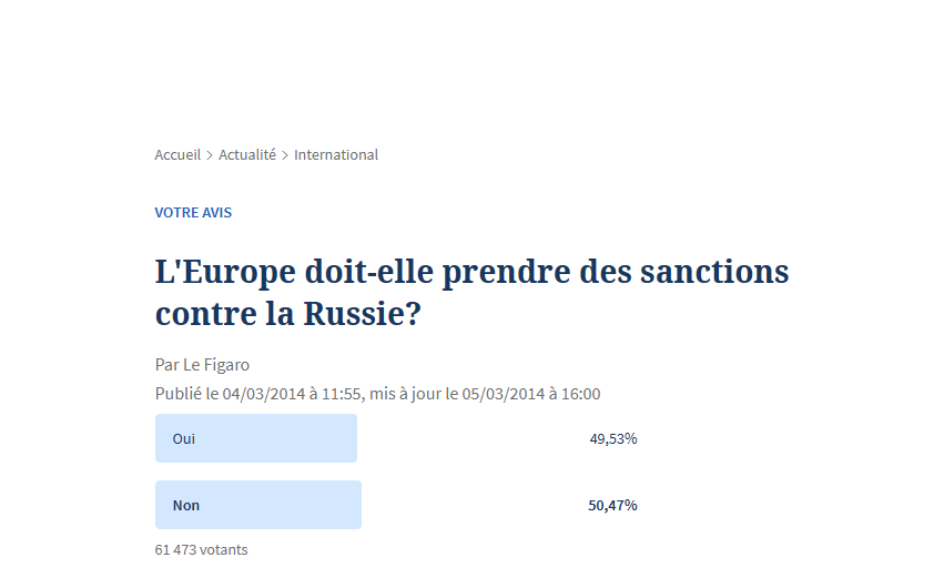 Et malgré cela, le non l'emporte toujours. Cette bande de loosers. Même en s'y mettant à plusieurs centaines, ils n'arrivent pas à faire pencher la balance d'un sondage en leur faveur malgré la propagande anti russes an France ahi.