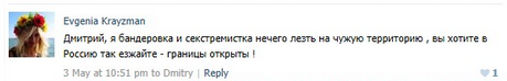 traduction : Dmitry, je suis une bandériste et une sexmrémiste. Si vous voulez, dégagez en Russie. Les frontières sont ouvertes.