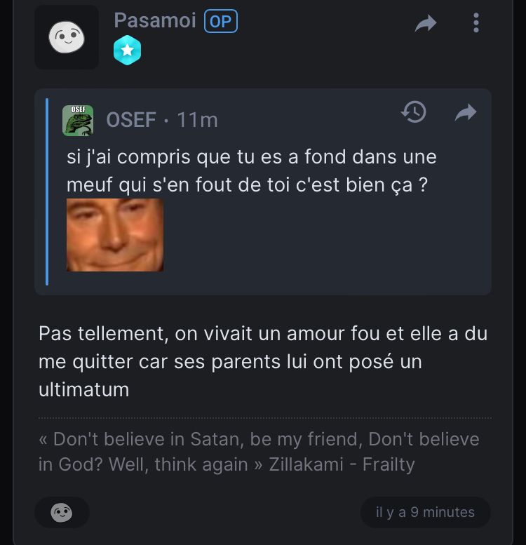 T’es con ou quoi ? J’ai littéralement dit dans mon PREMIER post qu’on était plus ensemble, à quoi bon me le redemander ?