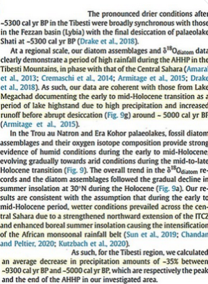 Publié dans ScienceDirect sur le sujet : The African Holocene Humid Period in the Tibesti mountains (central Sahara, Chad): Climate reconstruction inferred from fossil diatoms and their oxygen isotope composition