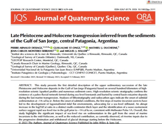 Publié par : PIERRE‐ARNAUD DESIAGE,1,2,3,4*GUILLAUME ST‐ONGE,1,3,4MATHIEU J. DUCHESNE,5JEAN‐CARLOS MONTERO‐SERRANO1,3and MIGUEL J. HALLER6,71Institut des sciences de la mer de Rimouski, Université du Québec à Rimouski, Rimouski, QC, Canada2Geological Survey of Canada (Atlantic), Dartmouth, NS, Canada3GEOTOP Research Center, Montréal, QC, Canada4Canada Research Chair in Marine Geology, Rimouski, QC, Canada5Geological Survey of Canada (Québec), Quebec City, QC, Canada6Universidad Nacional de la Patagonia San Juan Bosco (UNPSJB), Puerto Madryn, Argentina7Instituto Patagónico de Geología y Paleontología–CCT CENPAT‐CONICET, Puerto Madryn, Argentina