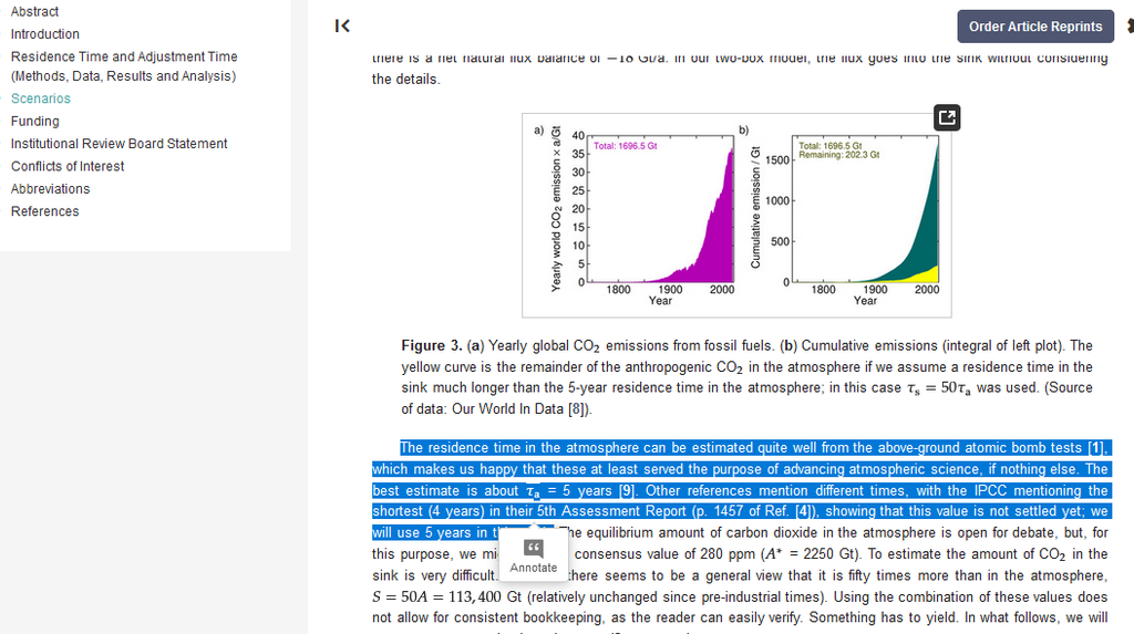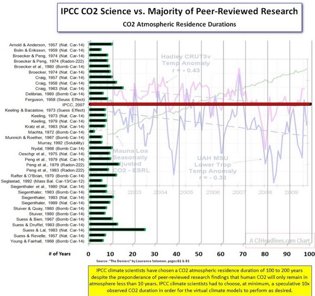 La plupart des recherches évalués par les pairs indiquent que le CO2 d'origine humain ne reste pas plus de 10 ans dans l'atmosphère.