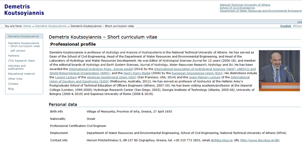 Prof. Em. Demetris Koutsoyiannis qui a à son actif pour le moment au moins 192 publications dans des revues scientifiques, 8 livres , 474 publications et interventions dans des conférences entre autres (975 contributions scientifiques et