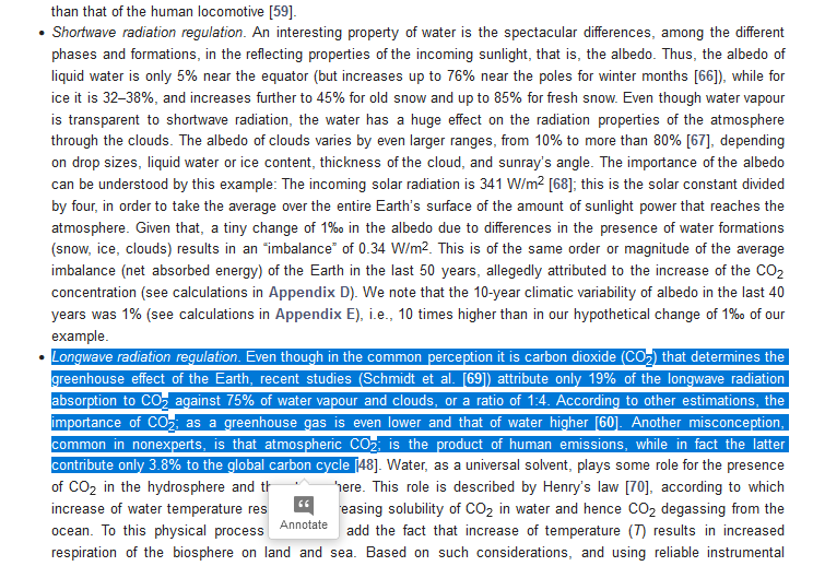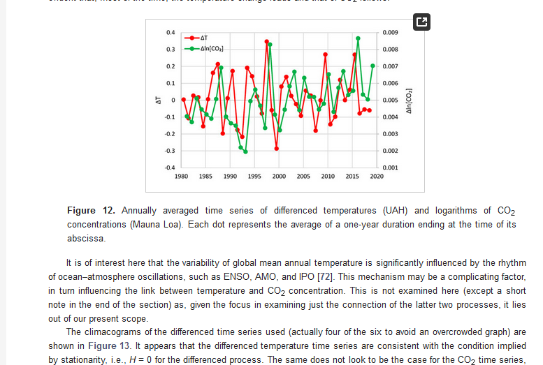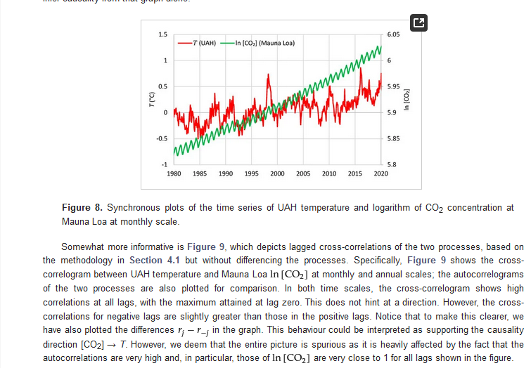 "A common misconception is that atmospheric CO2 is the product of human emissions, but in fact the latter only contribute 3.8%. The dominant direction of causality is T➝CO2 rather than vice versa.