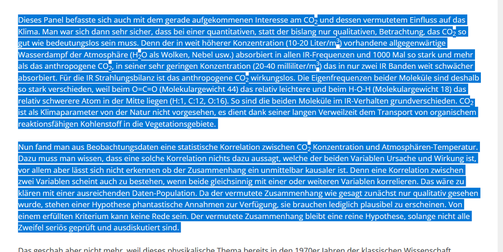 Désormais, à partir de données d’observation, une corrélation statistique a été trouvée entre la concentration de CO2 et la température atmosphérique. Il faut savoir qu'une telle corrélation ne dit rien sur laquelle des deux variables est cause et effet, mais surtout on ne voit pas si le lien est directement causal. Une corrélation entre deux variables semble également exister si les deux sont en corrélation dans le même sens avec l'une ou l'autre variable. Cela pourrait être clarifié avec une population de données suffisante. Comme, comme je l'ai dit, le lien suspecté n'a été initialement perçu que qualitativement, des hypothèses fantastiques sont disponibles pour une hypothèse ; il suffit qu'elles paraissent plausibles. Il ne peut être question qu’un critère soit rempli. Le lien suspecté reste une pure hypothèse jusqu'à ce que tous les doutes aient été sérieusement examinés et discutés.