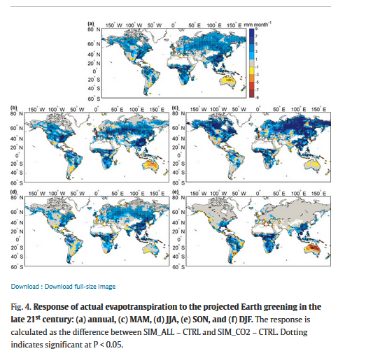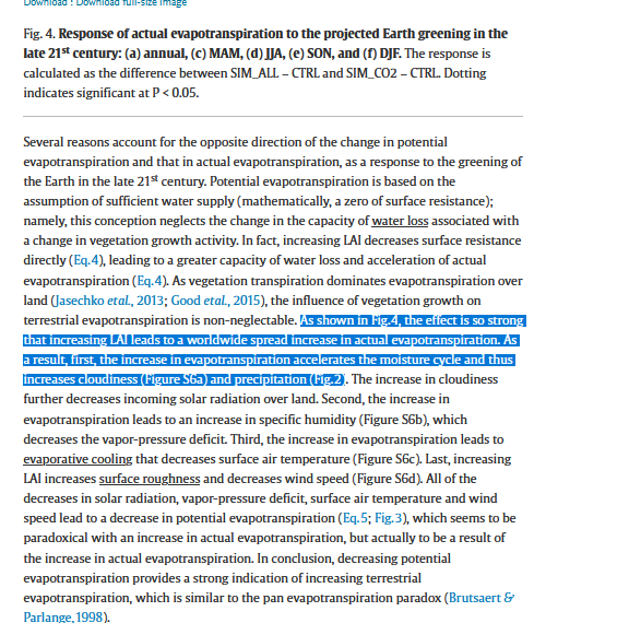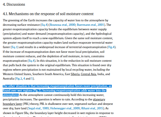 Enfin dans la partie 4, celle des discussions : The other situation is that increasing evapotranspiration favors more precipitation, as found over wet regions (Fig. 2). Increasing evapotranspiration adds water into the atmosphere.