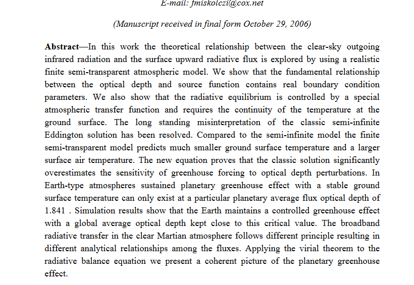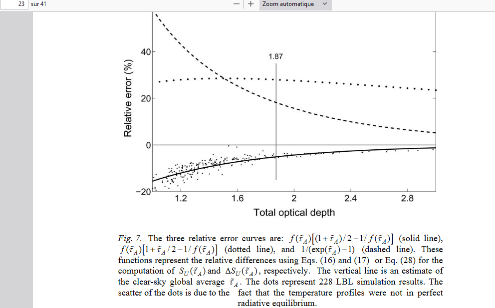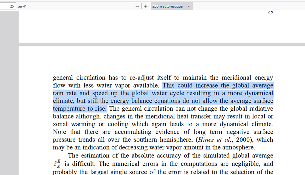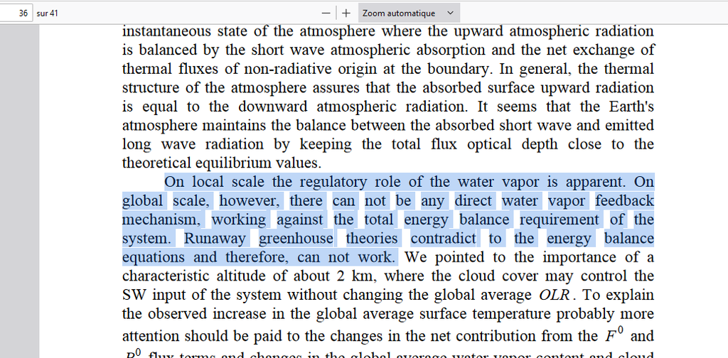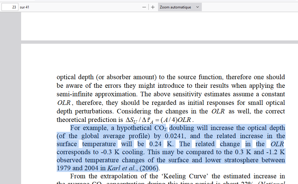 “Un doublement hypothétique du CO2 augmenterait la profondeur optique de 0.0241, et l’augmentation correspondante de la température de surface sera de 0.24 K (CO2x 2 = 0.24°C). [...] Il ne peut y avoir de mécanisme de rétroaction directe d'H2O”