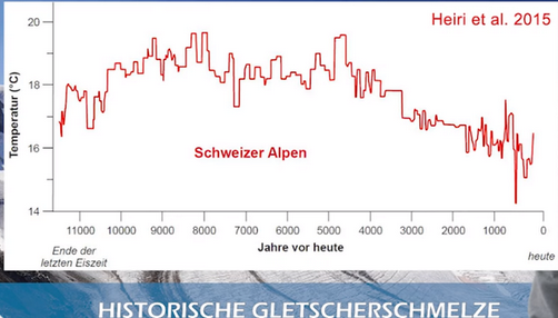 “In Roman times (~1.5°C warmer) in the Alps the forest line was much higher than today; there were hardly any glaciers” Geological giant Christian Schlüchter refutes the CO2 accusation.