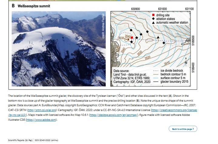Cette vidéo présente un article rédigé par les glaciologues Bohleber et al, 2020 de l’Académie autrichienne des sciences. L’équipe a découvert que le sommet de la Weißseespitze, qui culmine à 3500 mètres, était libre de glace il y a 5900 ans.