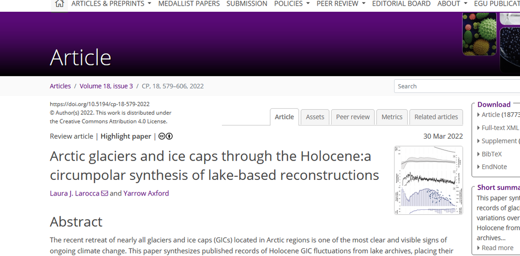 Une étude détaille comment un climat beaucoup plus chaud qu’aujourd’hui a conduit à la disparition des glaciers et calottes glaciaires au cours de l’Holocène à 300 ppm de CO2. L’étendue de glace moderne de l'Arctique est parmi les plus importantes des 10 000 dernières années. Les glaciologues Larocca et Axford (2022) ont synthétisé un enregistrement complet des glaciers et des calottes glaciaires (GIC) de l'ensemble de l’Arctique situés à proximité des lacs pour l’Alaska, Groenland, Arctique canadien, Islande, Scandinavie, Svalbard et Arctique russe. Ils ont comparé le volume et l’étendue actuels des GIC aux périodes passées de l’Holocène où ils étaient soit 1) plus petits qu’actuellement, soit 2) absents, ces dernières caractérisations signifiant une plus grande chaleur arctique.