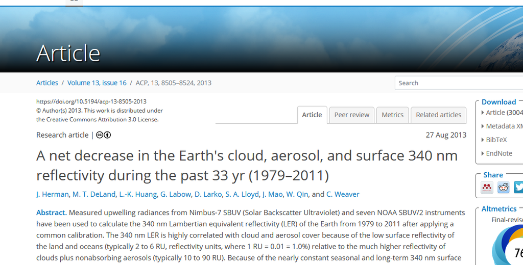 publié dans l'EGU ( European Geosciences Union ) sur le sujet : A net decrease in the Earth's cloud, aerosol, and surface 340 nm reflectivity during the past 33 yr (1979–2011) ; publié par J. Herman, M. T. DeLand, L.-K. Huang, G. Labow, D. Larko, S. A. Lloyd, J. Mao, W. Qin, and C. Weaver