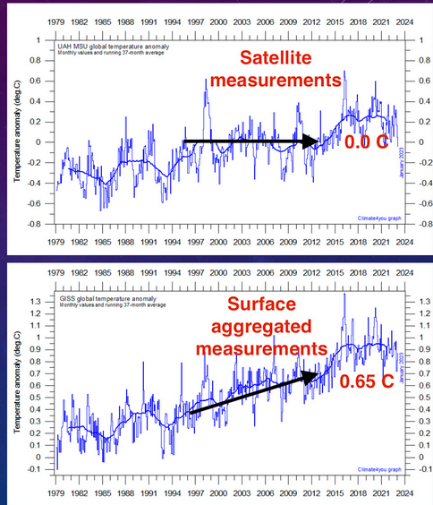 L'enregistrement de la température de surface a été manipulé presque au-delà de la reconnaissance. Ils appliquent depuis des décennies des «ajustements» visant à faire en sorte que la température mondiale suive le record officiel de CO2, qui est lui-même une simulation de modèle.