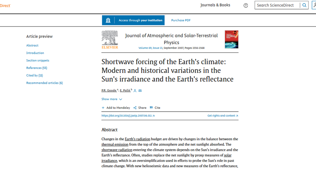 publié dans Science Direct sur le sujet : Shortwave forcing of the Earth's climate: Modern and historical variations in the Sun's irradiance and the Earth's reflectance ; publié par P.R. Goode ( Big Bear Solar Observatory, New Jersey Institute of Technology, Big Bear City, 92314, USA ) et E. Pallé ( Instituto de Astrofisica de Canarias, La Laguna, E38205, Spain )