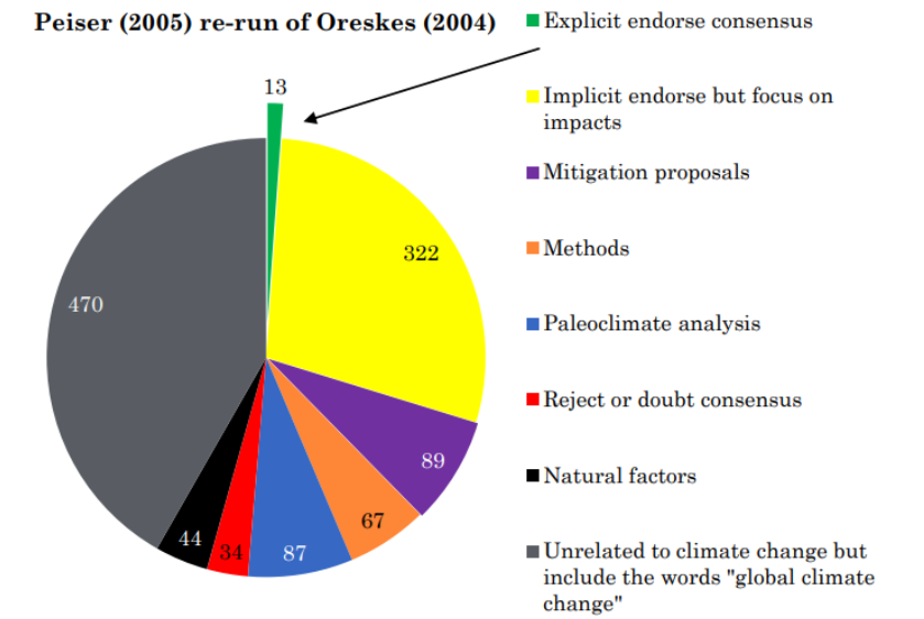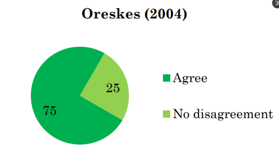 Par exemple, Naomi Oreskes (2004) a dit qu'elle était d'accord à 75 %. et "aucun désaccord"