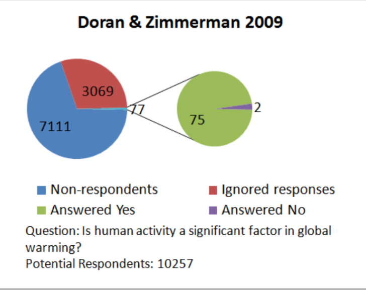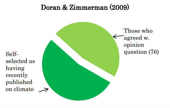 Doran et Zimmerman (2009) s'est appuyé sur 79 scientifiques autosélectionnés (qualifications non précisées) affirmant avoir publier quelque chose sur le changement climatique, et ce récemment.
