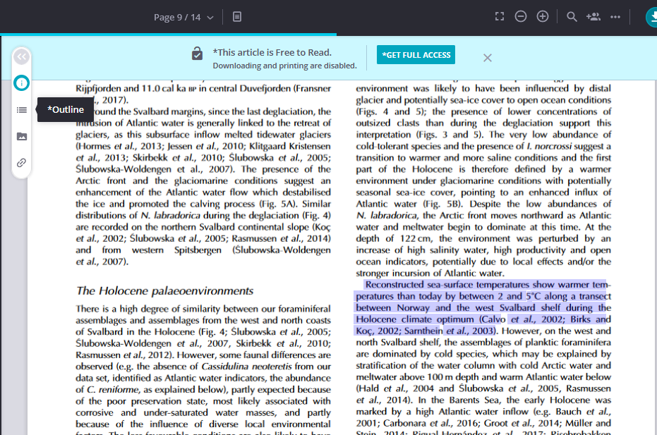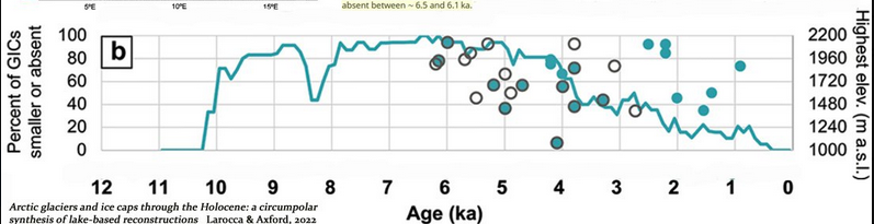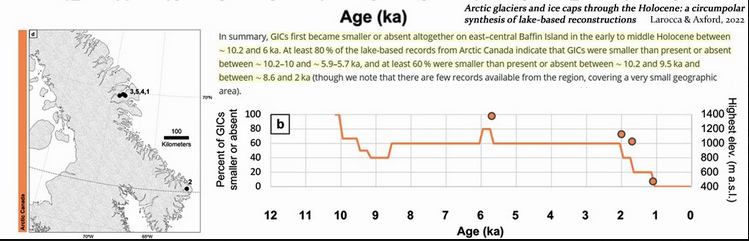Une étude explique comment un climat plus chaud qu’aujourd’hui a entraîné une diminution puis disparition des glaciers et calottes glaciaires au cours de l’Holocène à 300 ppm de CO2. Concrètement aujourd'hui, sur les 10 000 dernières années, l'étendu de l'Arctique est plus l'une des plus importantes aujourd'hui. Larocca et Axford qui sont glaciologues, sont parvenus à synthétisé un enregistrement complet des glaciers et des calottes glaciaires de l'Arctique situés à côté des lacs pour l’Alaska, Groenland, Arctique canadien, Islande, Scandinavie, Svalbard et Arctique russe. Ils ont comparé le volume et l’étendue actuels des GIC aux périodes passées de l’Holocène où ils étaient soit 1) plus petits qu’actuellement, soit 2) absents, ces dernières caractérisations signifiant une plus grande chaleur arctique.