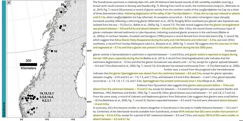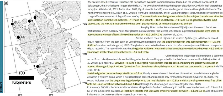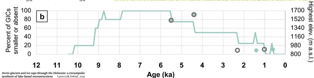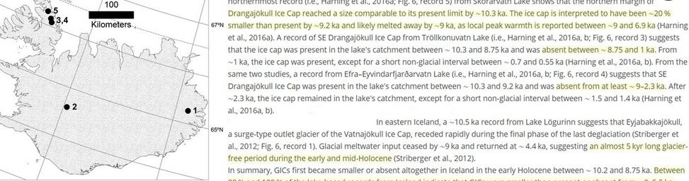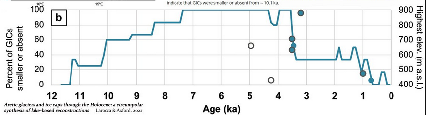 La preuve les glaciologues ont trouvé que plus de la moitié des GIC de l’Arctique existant aujourd’hui n’'étaient pas ou avaient un volume plus réduit Il y a 10 000 à 3 400 ans, quand le CO2 atmosphérique variait entre 260 et 270 ppm. De plus, la plupart étaient plus petits qu’aujourd’hui ou absents il y a 7 900 à 4 500 ans, ce qui était le pic de la chaleur arctique de cet interglaciaire et plusieurs degrés celsius plus chaud qu’aujourd’hui.