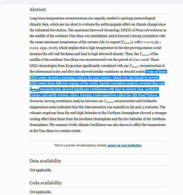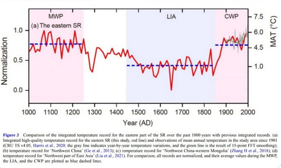 Une nouvelle étude explique qu'au cours du dernier millénaire, soit les 1 000 années précédentes, le long des vastes routes commerciales de la Route de la soie en Eurasie, la fameuse période de réchauffement médiéval (MWP), qui a je le rappelle duré de 900 à 1 200 a été plus chaude que la période de réchauffement qu'il y a eu au début du XIXème siècle(CWP).