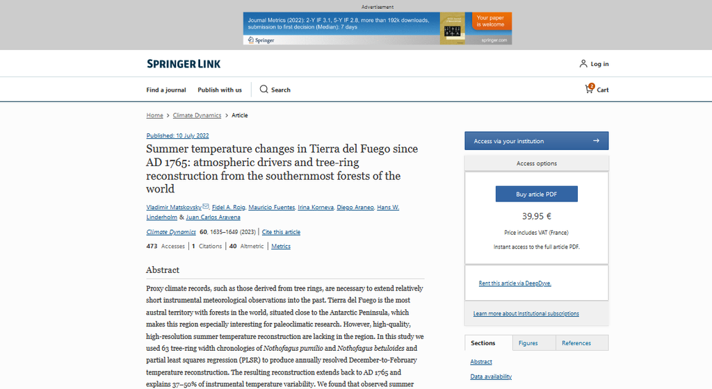Publié en juillet 2022 sur le sujet : Summer temperature changes in Tierra del Fuego since AD 1765: atmospheric drivers and tree-ring reconstruction from the southernmost forests of the world