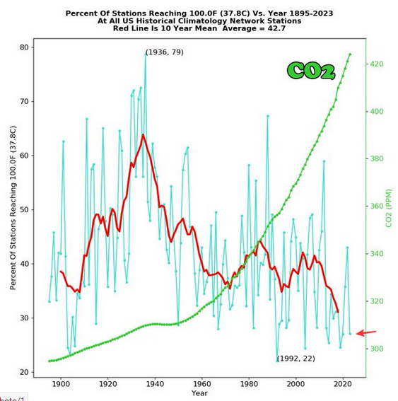 Pour ce qui est des Etats Unis et de l'été 2023, il faut savoir que à mesure que le CO2 atmosphérique a augmenté, le pourcentage des États-Unis atteignant 100F (38C) au cours de l'année a chuté - cette année étant jusqu'à présent la neuvième plus basse jamais enregistrée depuis 1895.