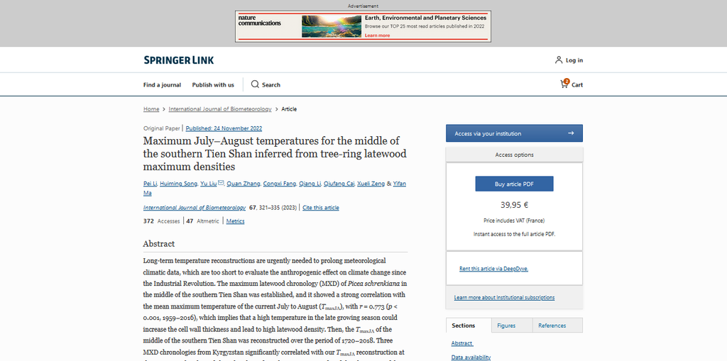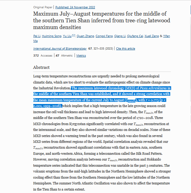Sur le sujet : Maximum July–August temperatures for the middle of the southern Tien Shan inferred from tree-ring latewood maximum densities