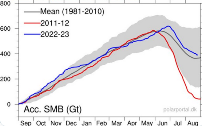 La couverture totale de glace du Groenland pour 2022-2023 (bleu) a continué d'être élevée bien au-dessus de la moyenne 1981-2010 (gris foncé), non seulement au cours des derniers mois, mais au cours de l'année dernière.