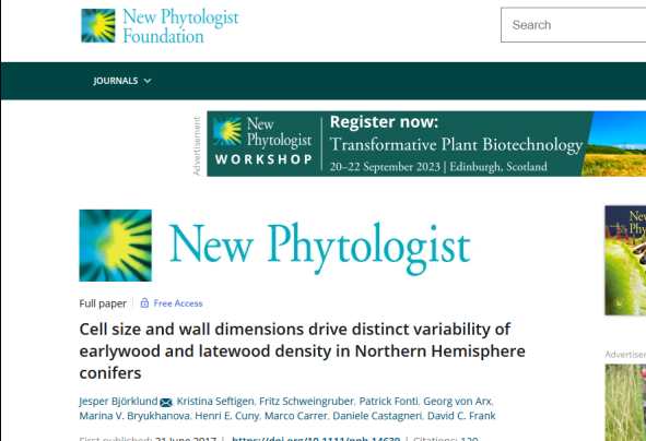 Björklund J, Seftigen K, Schweingruber F, Fonti P, von Arx G, Bryukhanova MV, Cuny HE, Carrer M, Castagneri D, Frank DC (2017) Cell size and wall dimensions drive distinct variability of earlywood and latewood density in Northern Hemisphere conifers. New Phytol 216:728–740.