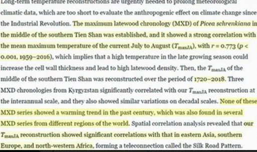 En évaluant les températures de 1 720 à 2018, les données MXD montrent un refroidissement depuis 1900 (environ 1 °C de plus dans les années 1920-1930).