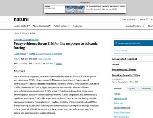 Adams JB, Mann ME, Ammann CM (2003) Proxy evidence for an EI Niño-like response to volcanic forcing. Nature 426:274–278.
