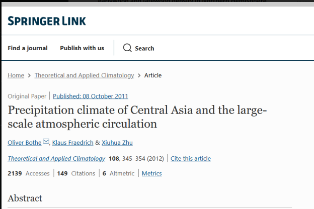 Bothe O, Fraedrich K, Zhu XH (2012) Precipitation climate of Central Asia and the large-scale atmospheric circulation. Theoret Appl Climatol 108:345–354.
