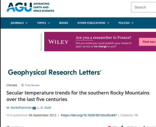 Berkelhammer M, Stott LD (2012) Secular temperature trends for the southern Rocky Mountains over the last five centuries. Geophys Res Lett 39:17701–17706.