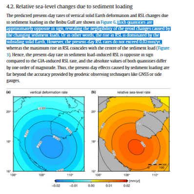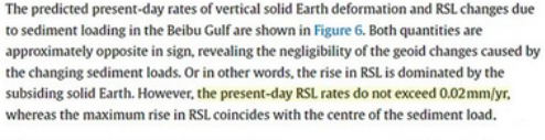 " Both quantities are approximately opposite in sign, revealing the negligibility of the geoid changes caused by the changing sediment loads. Or in other words, the rise in RSL is dominated by the subsiding solid Earth. However, the present-day RSL rates do not exceed 0.02 mm/yr, "