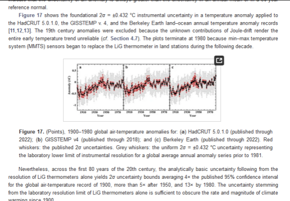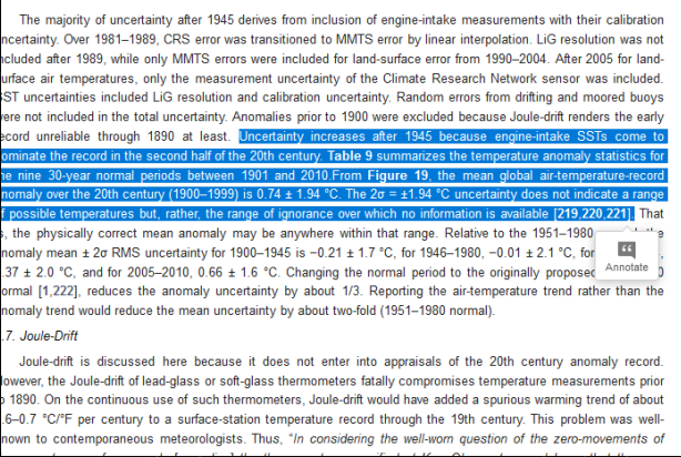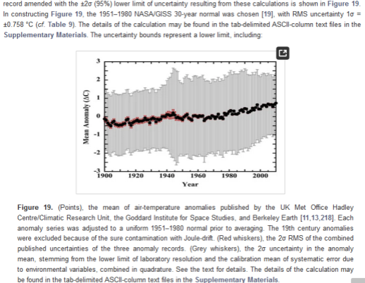 "Uncertainty increases after 1945 because engine-intake SSTs come to dominate the record in the second half of the 20th century. Table 9 summarizes the temperature anomaly statistics for the nine 30-year normal periods between 1901 and 2010.From Figure 19, the mean global air-temperature-record anomaly over the 20th century (1900–1999) is 0.74 ± 1.94 °C. The 2σ = ±1.94 °C uncertainty does not indicate a range of possible temperatures but, rather, the range of ignorance over which no information is available [219,220,221]. That is, the physically correct mean anomaly may be anywhere within that range."