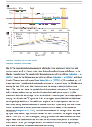 "The RSL change in this area is estimated from SLIPs obtained by this study considering the change in the depositional environment (Table 2, Fig. 11). The RSL change curves around the Shimokita Peninsula, where the influence of crustal deformation is small, are estimated from the GIA model and SLIPs (Yokoyama et al., 2012)."