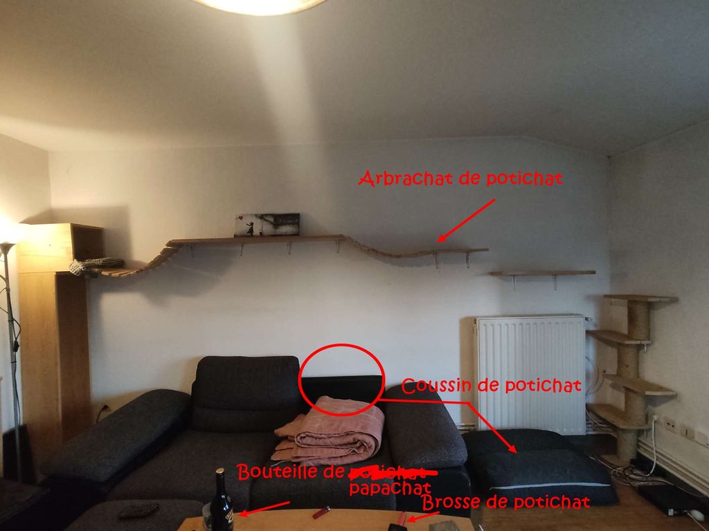 Elle a un potit hamac sur une fenêtre, des jouets pendouillants à peu près sur chaque meuble, une chaise à côté de la mienne pour être à côté de moi quand j'suis sur le pc, de quoi grimper sur mes armoires et une couette au dessus de l'une d'entre elle pour dormir dessus, un p'tit coussin sur la table de nuit, des jouets qui trainent partout, une grillage à la fenêtre pour qu'elle puisse prendre l'air sans risques...