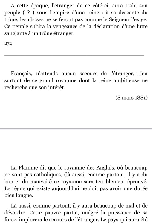 « ...Mes enfants, avant même peut-être que la première crise de la Fille aînée de l’Église ne soit commencée, il y aura des nouvelles douloureuses de ces peuples : Angleterre, Perse, Jérusalem. Tous auront subi de grands maux. »