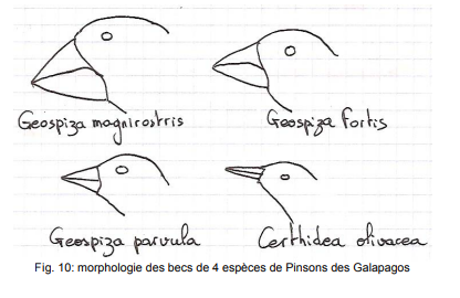 De plus, Darwin observe que la morphologie du bec des pinsons correspond au régime alimentaire de ceuxci, les aliments consommés étant d'autant plus durs (graines) que le bec est court et épais, tandis que les