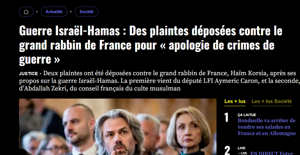 JUSTICE•Deux plaintes ont été déposées contre le grand rabbin de France, Haïm Korsia, après ses propos sur la guerre Israël-Hamas. La première vient du député LFI Aymeric Caron, et la seconde, d’Abdallah Zekri, du conseil français du culte musulman