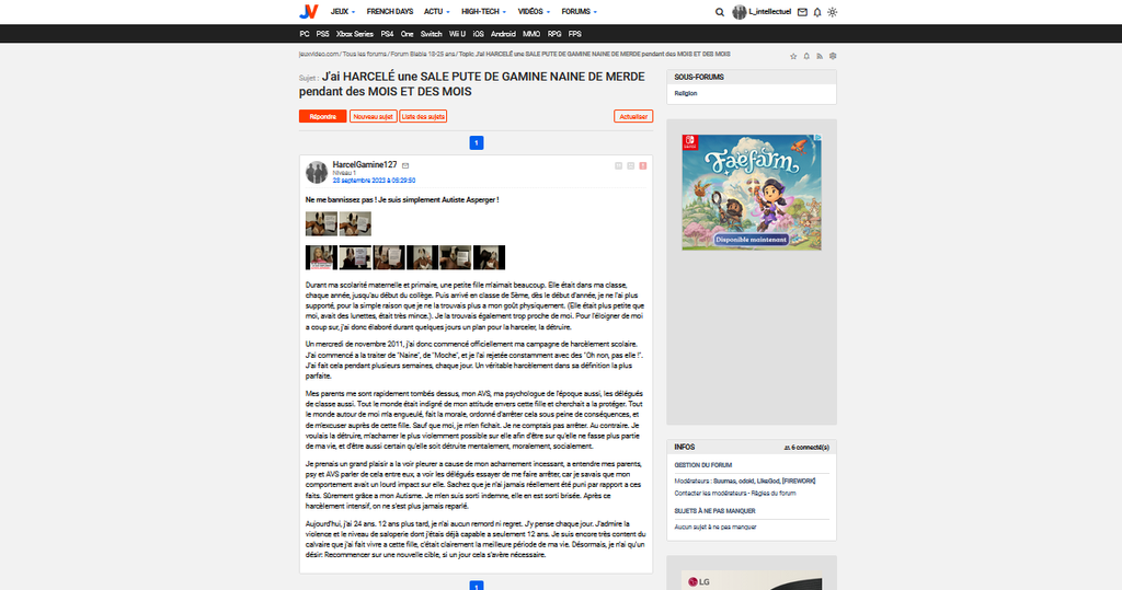 Le message en question : J'aime voir les gens souffrir, être terriblement choqués par mon contenu, les voir pleurer, paniquer... ça est mon plus grand plaisir... Pour rien au monde je n'arrêtai de poster mes images au grand public, car c'est mon objectif : choquer, traumatiser, énerver, dégoûter, mettre mal, déranger... ça fais 4 ans que je fais ça sur discord, chaque jour, 9 ans que je fais ça sur pleins de forums, des centaines de gens ont été choqués, et ce n'est pas prêt de s'arrêter, bien au contraire, la jouissance tirée est bien trop importante pour que je puisse m'arrêter un jour...
