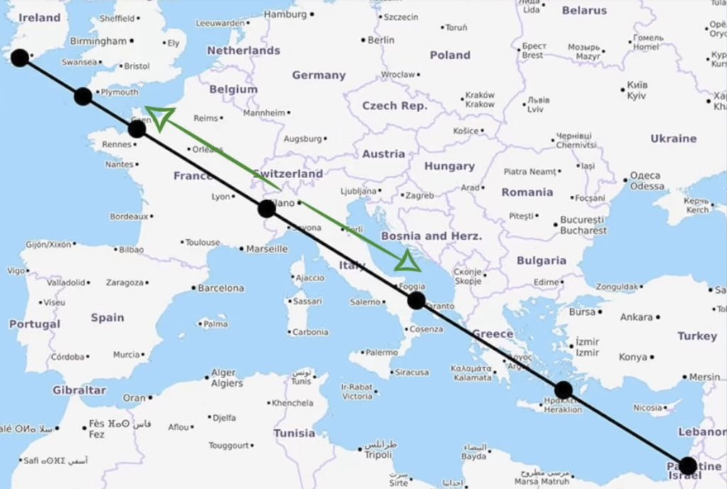 De l’Irlande à Israël (Jérusalem), sept sanctuaires lui sont dédiés dans le monde, qui forment cet étonnant alignement (ligne noire).