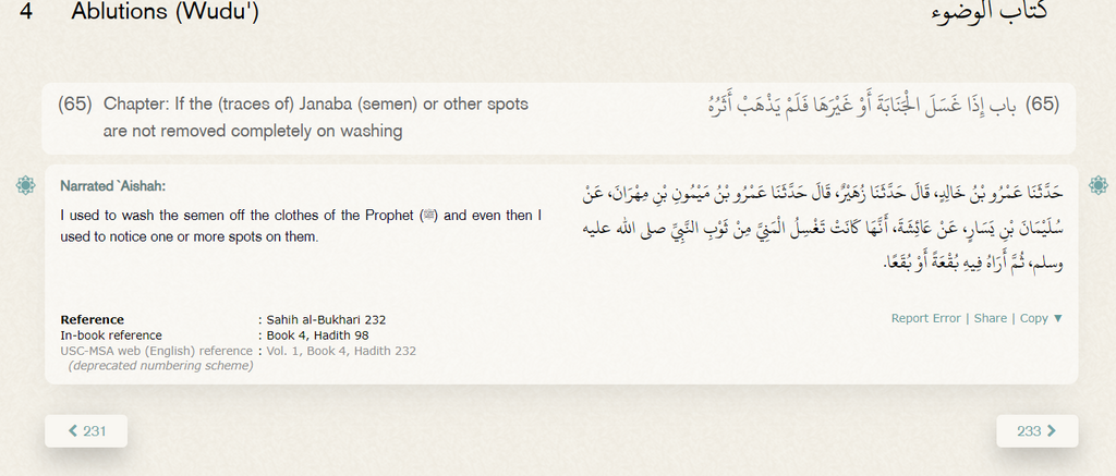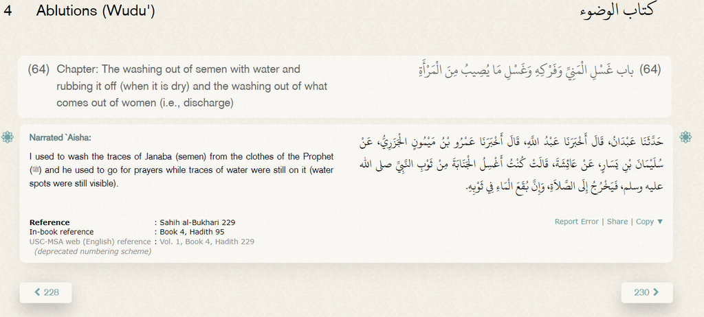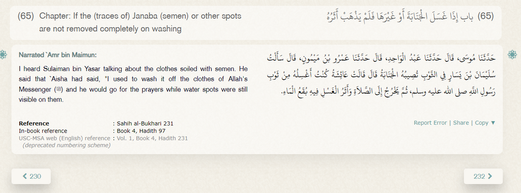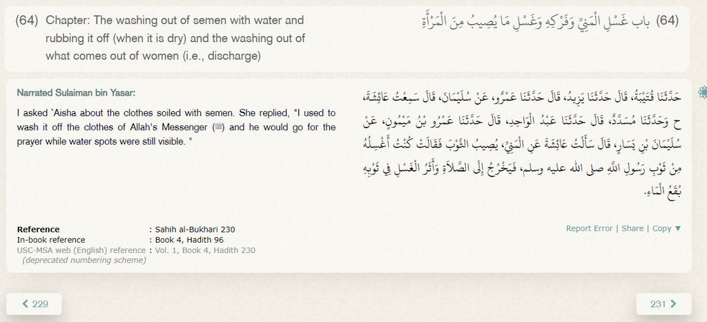 Il est écrit que Aisha la jeune épouse du prophète Nettoyé les Traces de sperme présent sur ses Vêtement pendant qu'il se dirigez vers la Mosquée pour Priez !