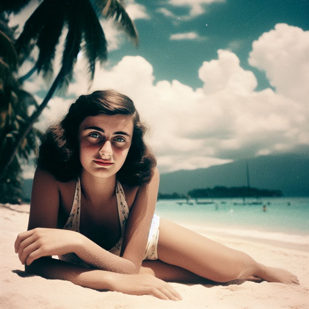 "anne m frank taking selfie picture in beach in swimsuit , high quality"