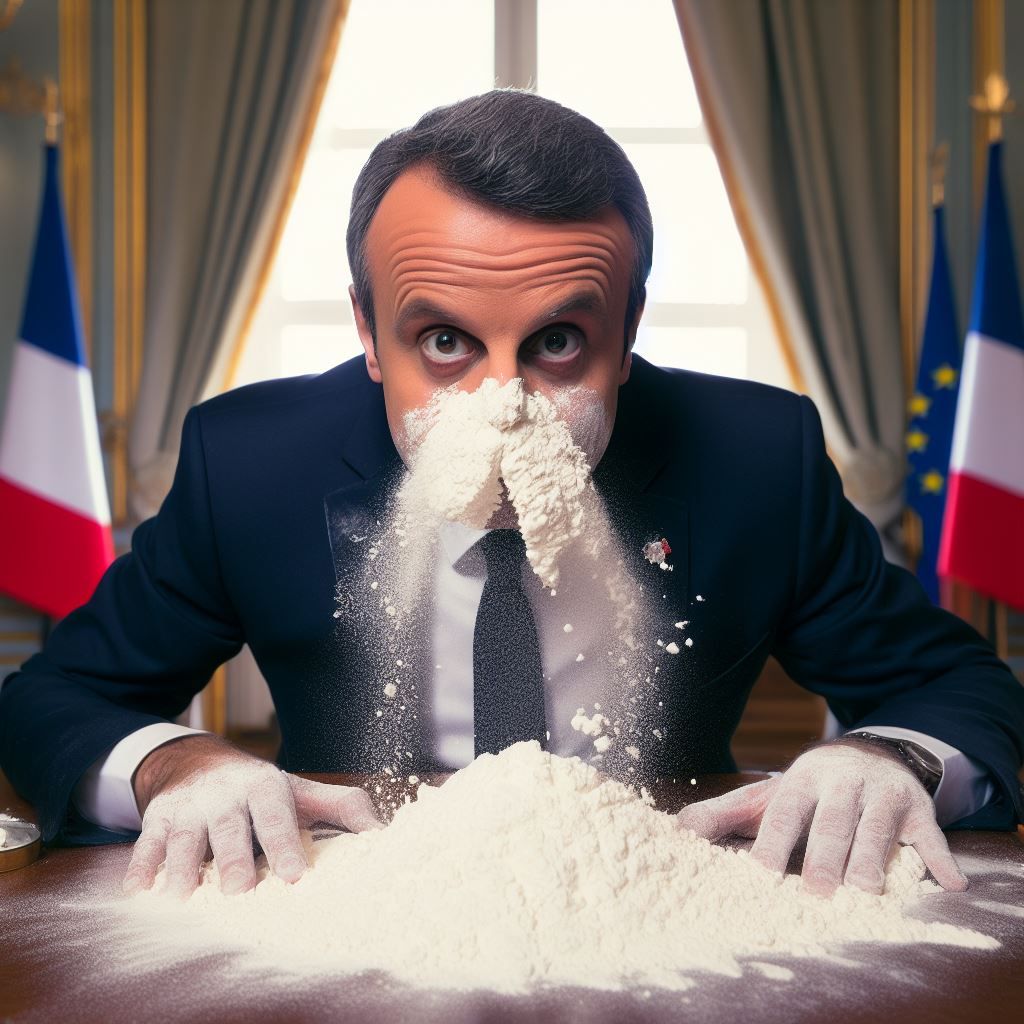 "emanuel french president with flour on his desk in elysee palace trhough his nose"
