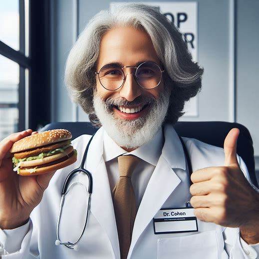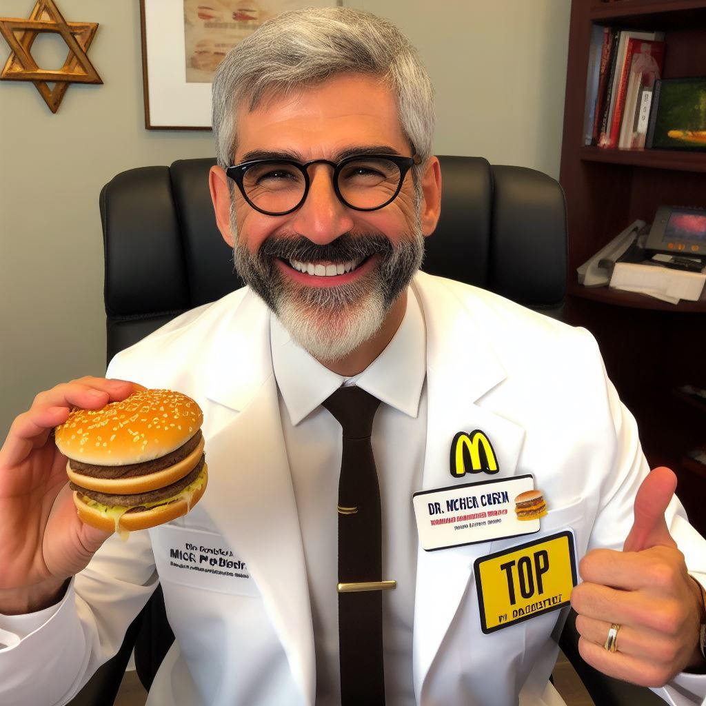 Hebraic doctor with grey hair, long nose, and glasses smiling, with a white suit, with a card on his chest with "Dr. COHEN" written on it. He is showing us a Big Mac sandwich from McDonald on the left hand, and he is doing a thumb up with his right hand. he is sitting in an office with a sign in the wall, where is is "Top produit" written on it