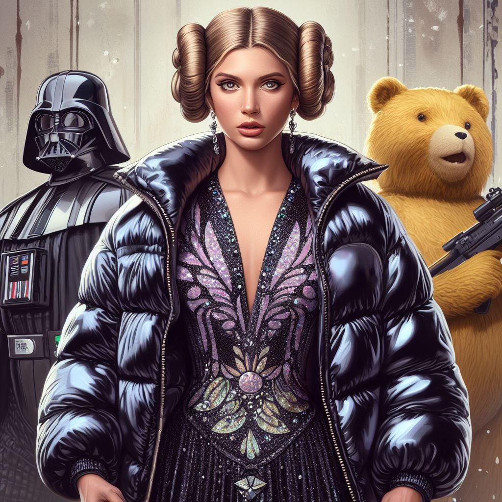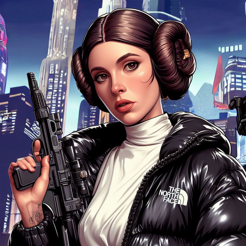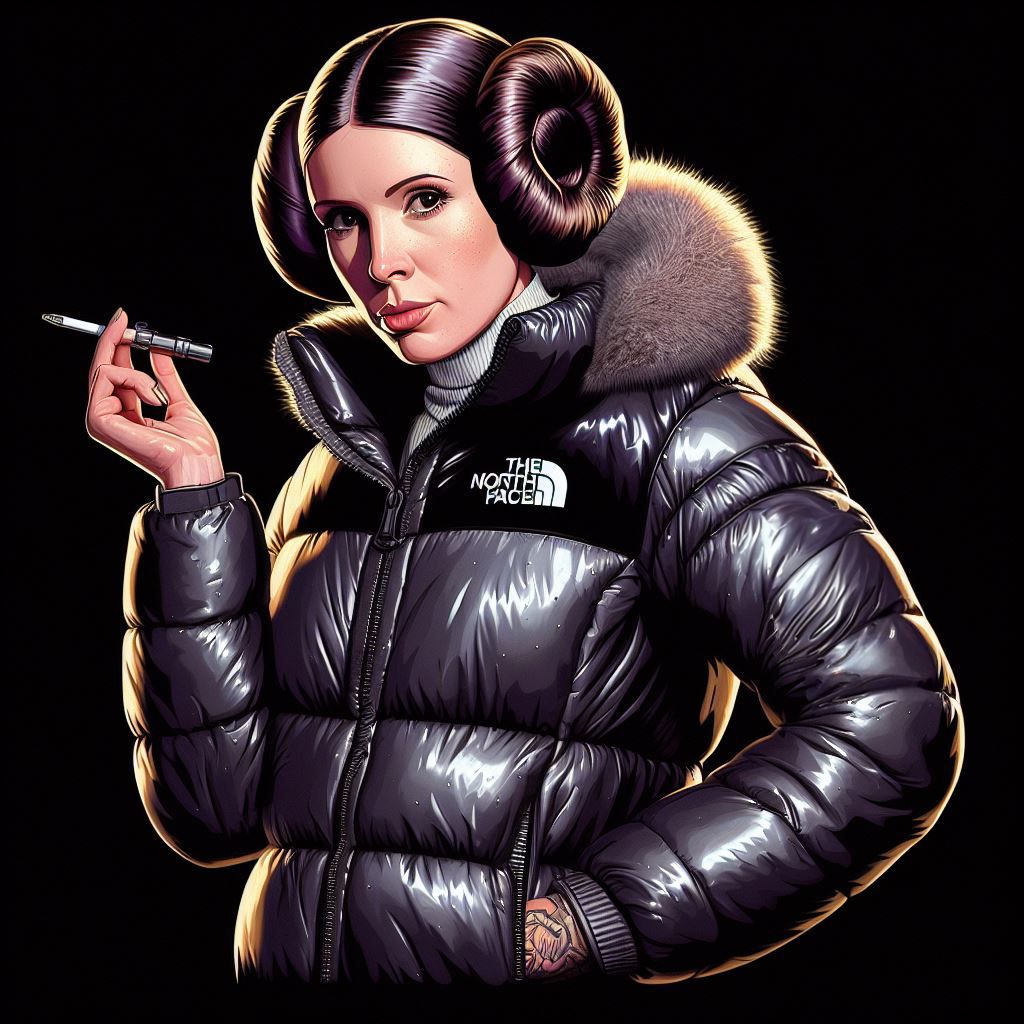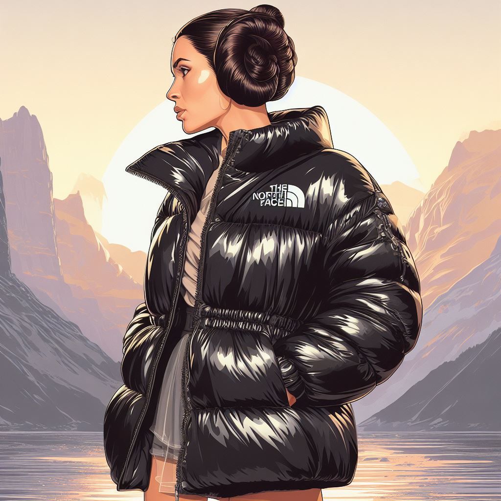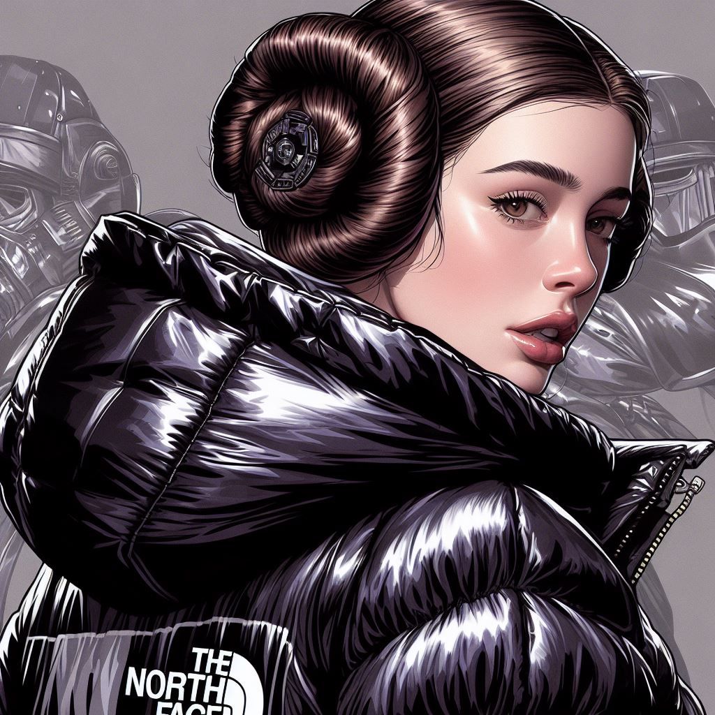 Princess Leia Organa in short black shiny puffer jacket, The north face nuptse 700, gta artworks