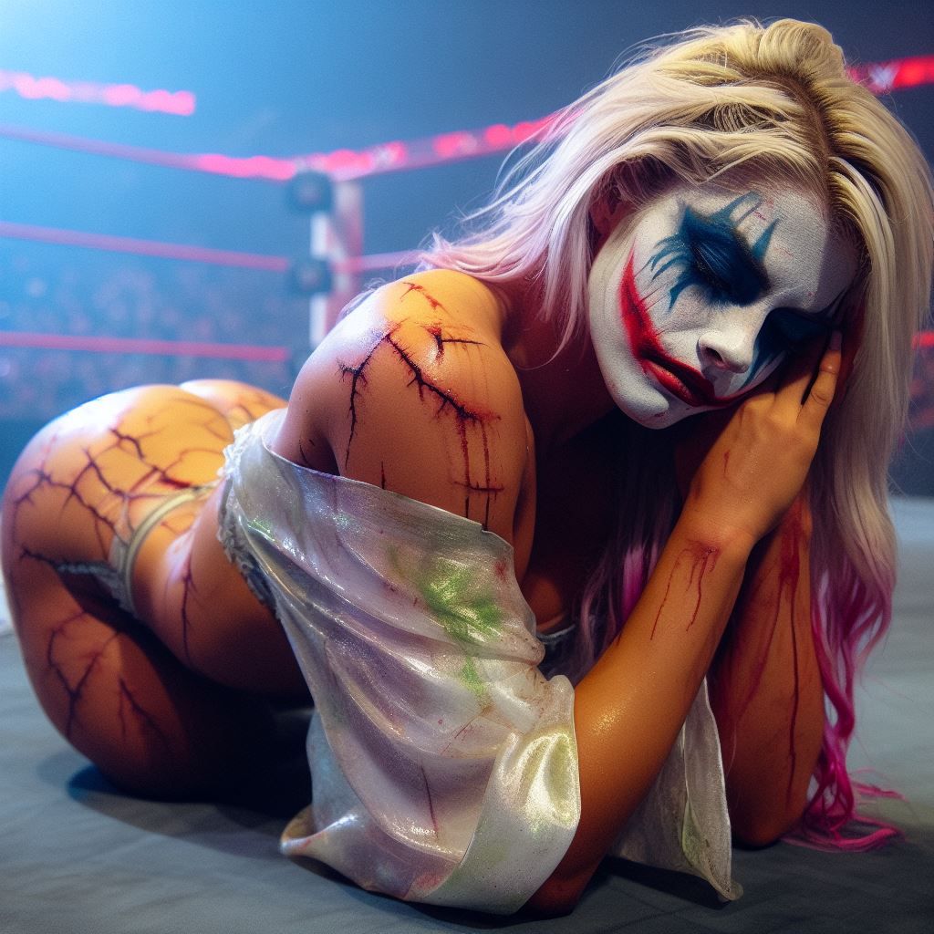 marque le dans un contexte comme j'ai fait " Alexa Bliss sits down in an wwe ring reading a magazine , legs apart , hippy foot , wearing a huge ethereal shortie pyjama , front view , heavy rain , strongly drenched , high definition , ultra sharpness "
