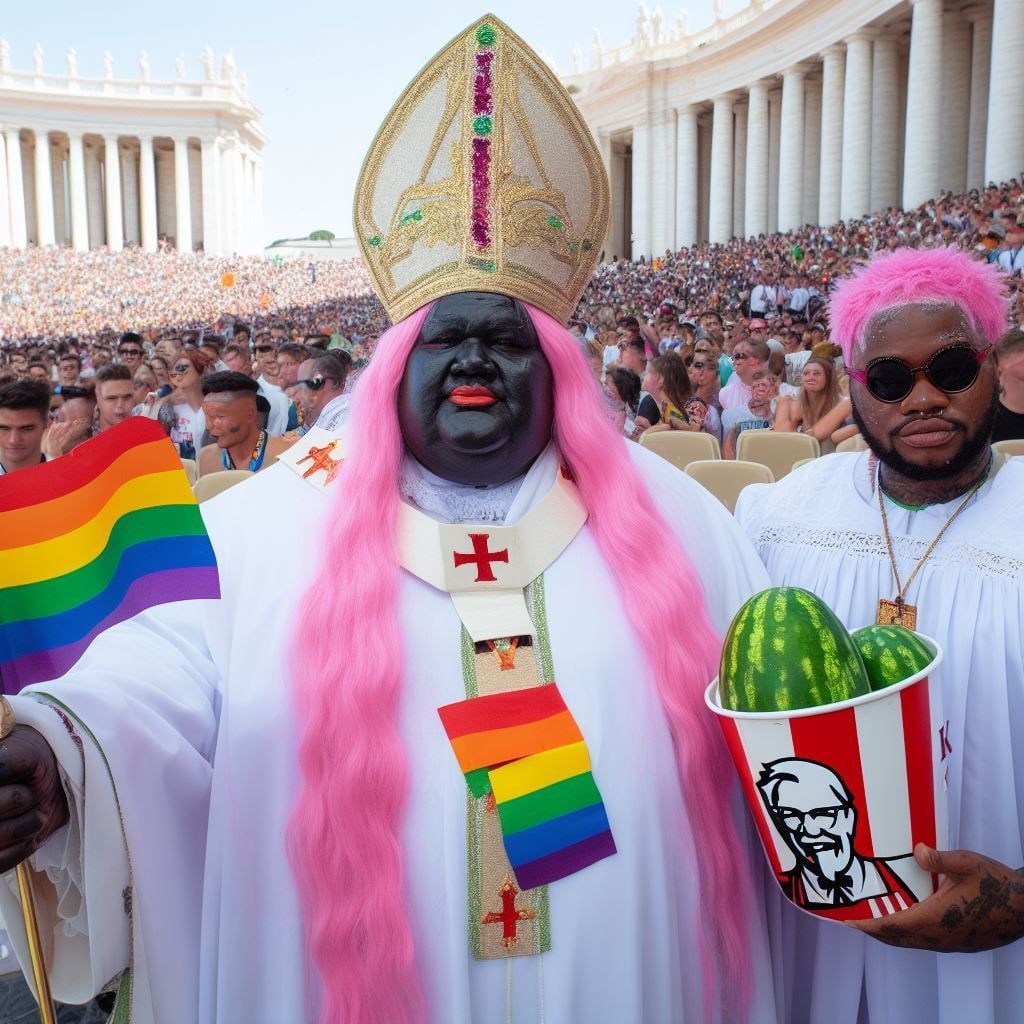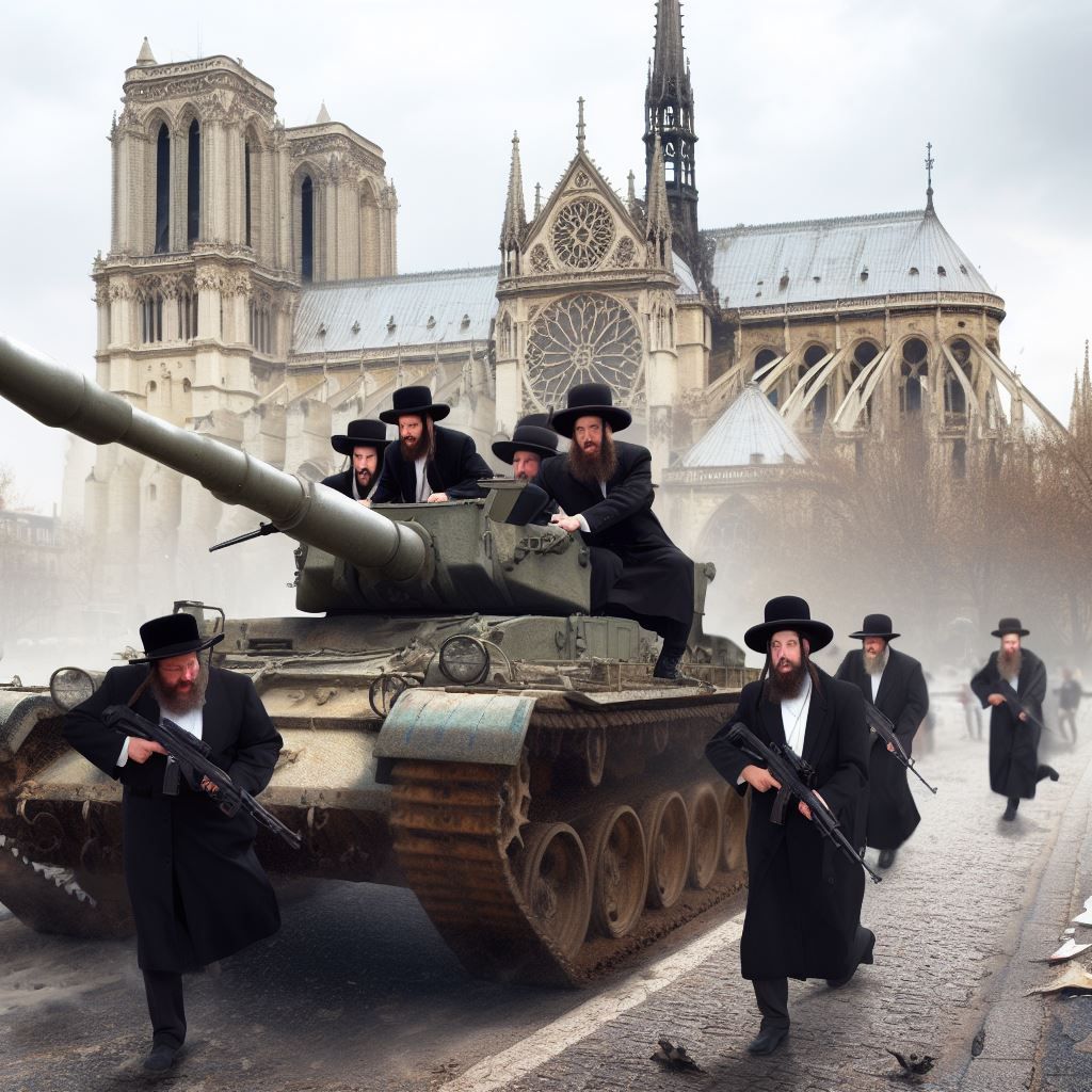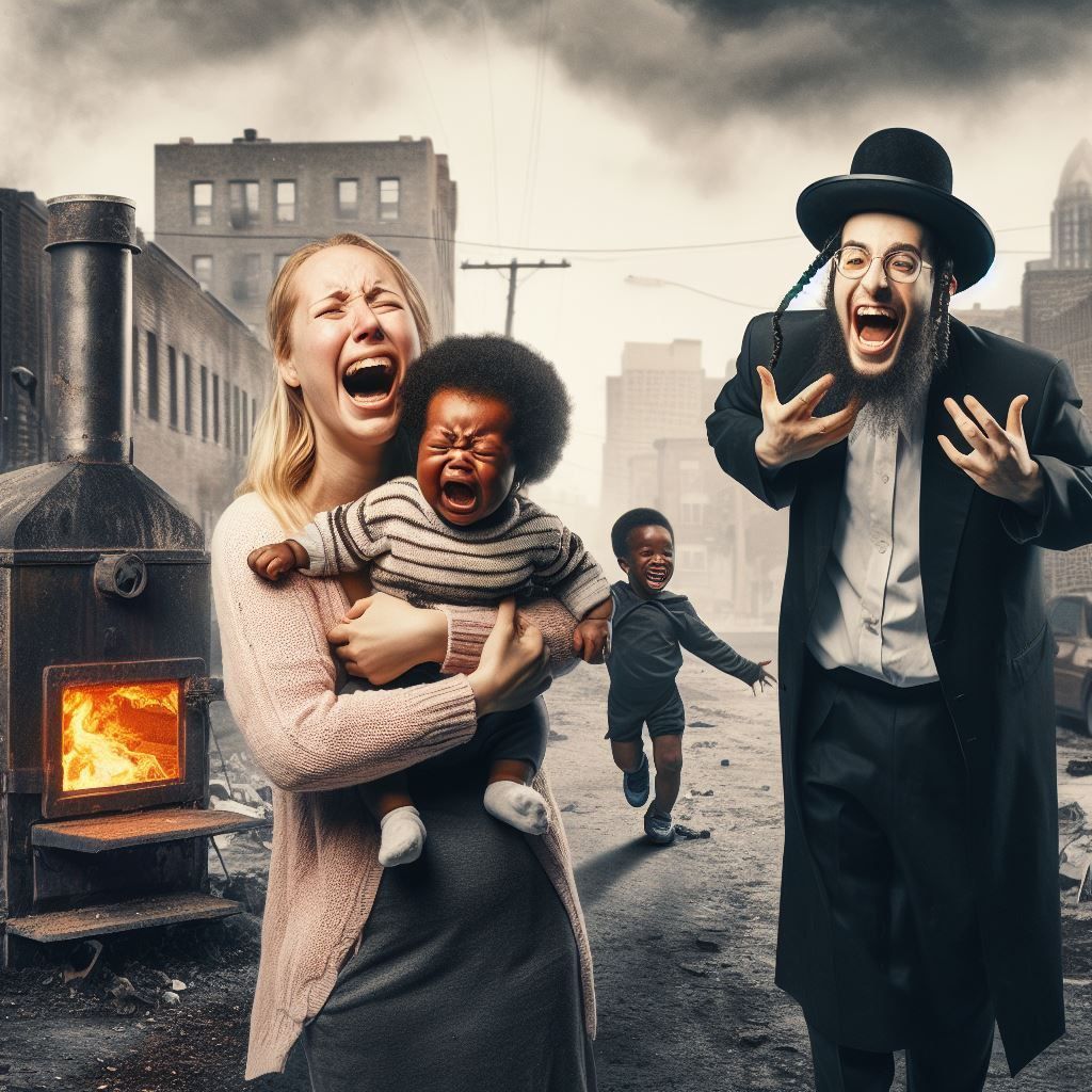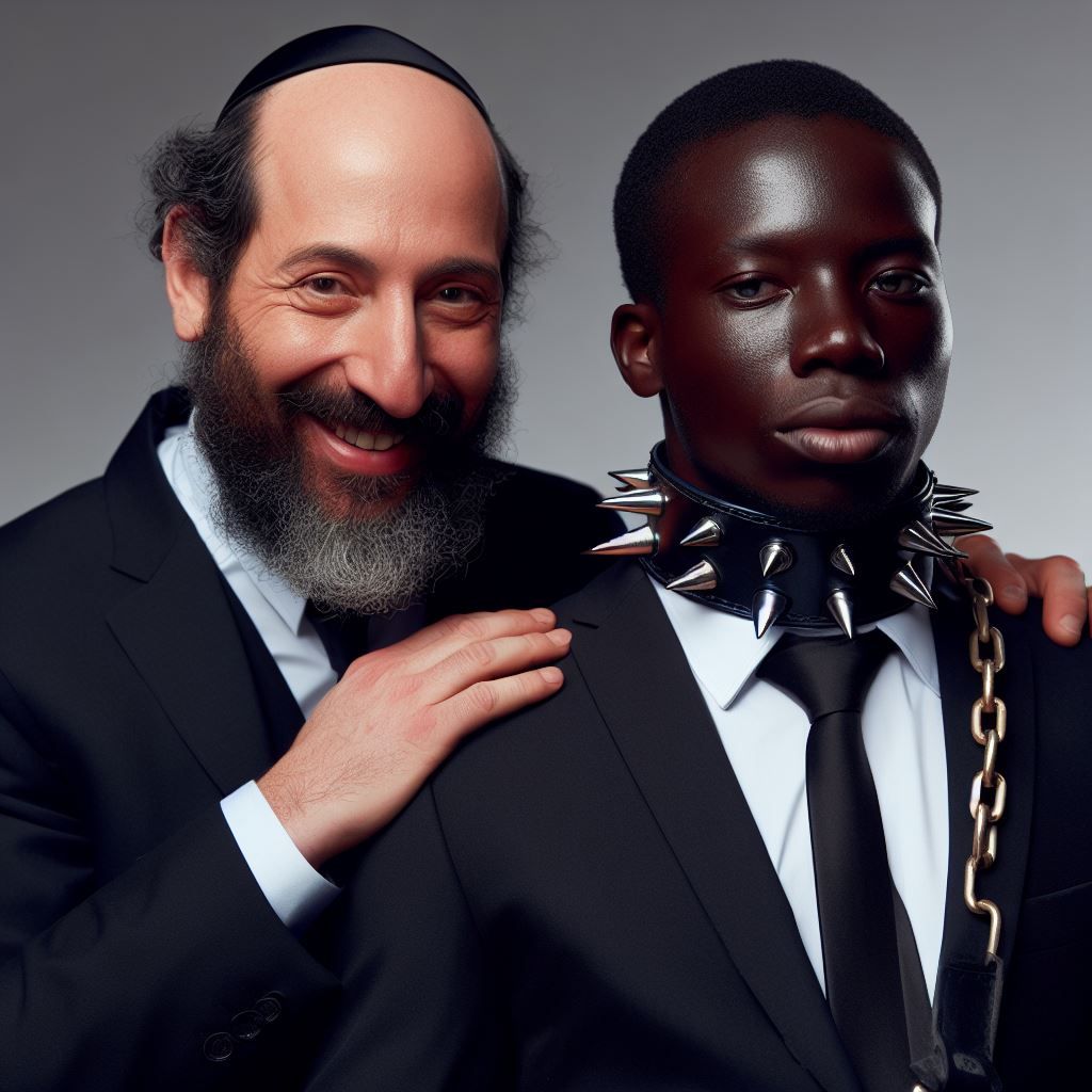 Pour la première, c'était : " Un homme au nez crochu portant une crèpe sur la tête tient par les épaules un individu captif de couleur sombre " ?