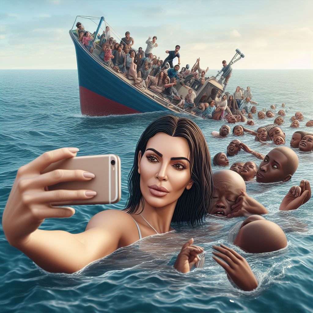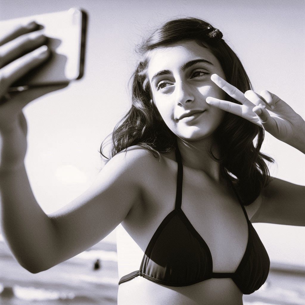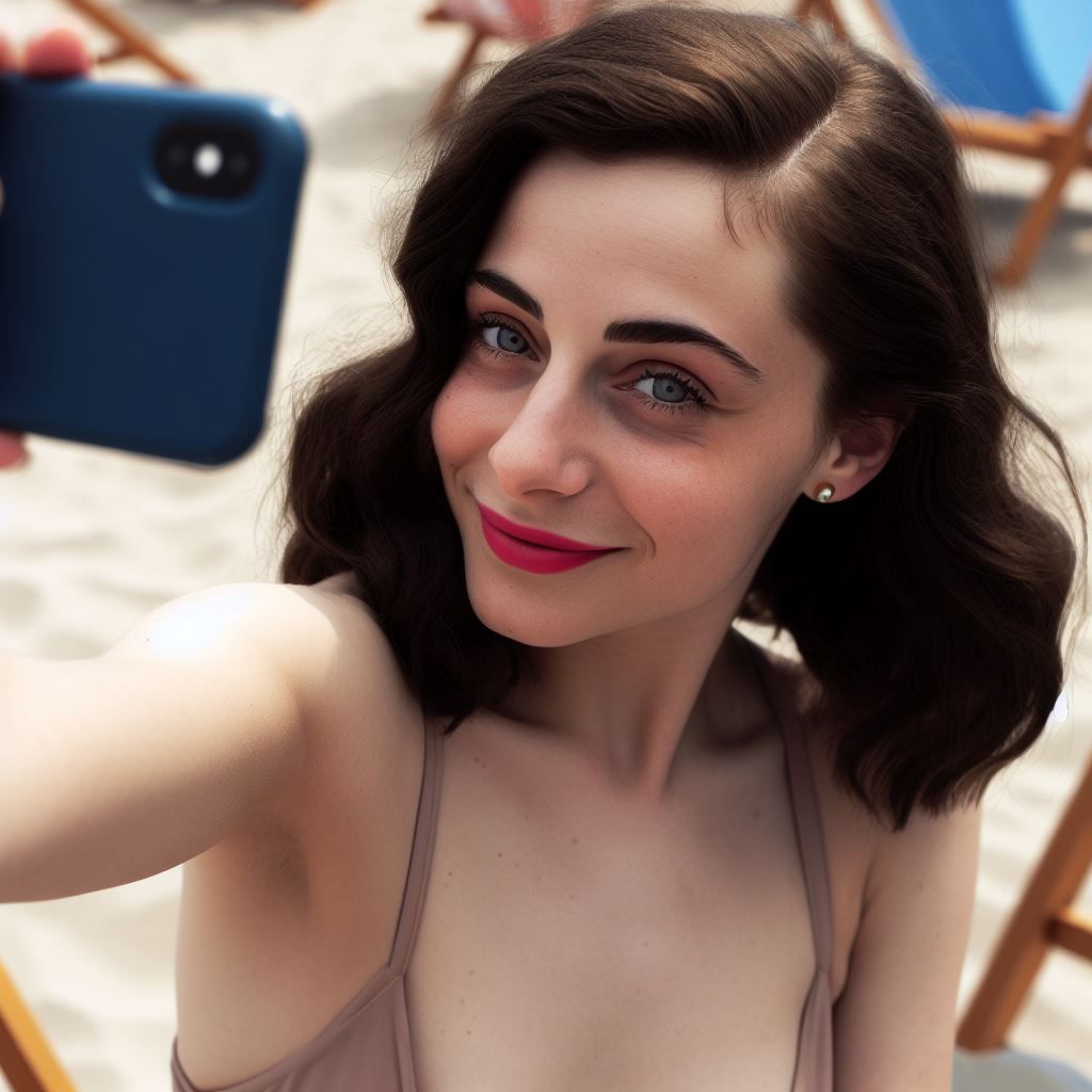 "anne m frank taking selfie picture in beach in swimsuit , high quality"