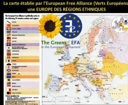 Et malgré cela, l'union démocratique bretonne s'est présenté aux élections européenns de 2012 avec le drapeau breton. Et surtout, avec le soutien des vers EELV. Avec des personnalité comme Cohn Bendit d'ailleurs. Il est à noter que nombre d'organisations régionales font de plus en plus leur promotion en ne mentionnant plus la France. Sur une carte que les verts européens de l'European Free Alliance ont fait circulé, on a vu qu'ils ont fait circulé une carte représentant une Europe des régions ethniques. Avec l'Allemagne récupérant non seulement la Silésie mais également une partie de la République Tchèque. Je rappelle que l'union du duché de Bretagne avec le royaume de France s'est fait en 1532. Pour les Catalans, c'était le Traité des Pyrénées de 1659. Pour les Alsaciens, ce fut le traité de Westphalie de 1648 et le traité de Riswick de 1697. Pour les Corses, c'est la bataille de Ponte Novu de 1769. Pour les Savoyards, ce fut le traité de Turin de 1860.